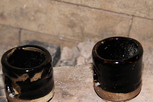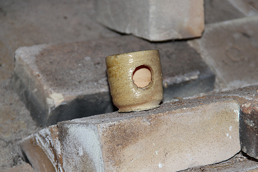 The 1st row : Last year, roughness appeared on the rims of the pieces, (the temperature dropped from the side stoking, and carbon clung onto the surface). This year, there was no roughness, only smoothness, because of "hiura," a back heating technique used to reduce the amount of direct heat. The pieces were well-baked compared to last year's firing, so the pieces had a shine, their surfaces were smooth, and the tightness of the clay was good.